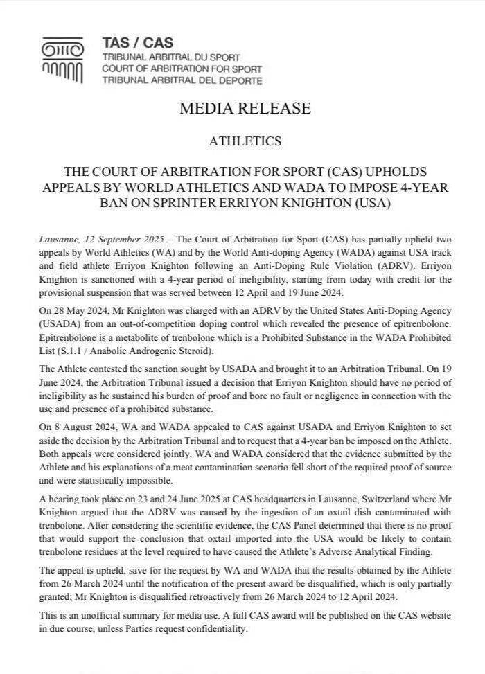 本地时间9月12日,位于洛桑的国际体育仲裁法庭(CAS)颁布发表,支撑世界田联和世界反兴奋剂机构(WADA)的上诉,对美国田径活动员埃里扬·奈顿处以4年禁赛,本日生效。同时,该活动员正在2024年3月26日至4月12日期间取得的成就也被打消。