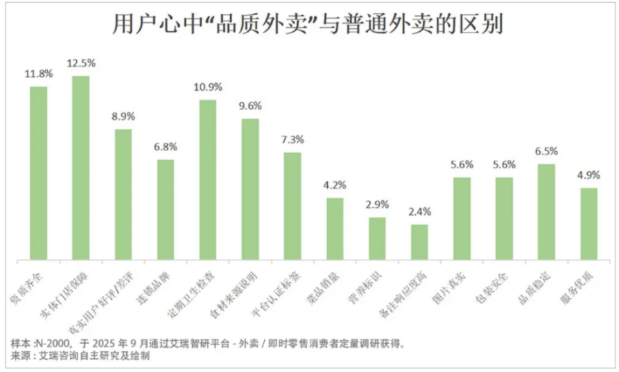 调研显示,消费者承认的质量外卖前三大目标是实体门铺保障、天分齐备以及按期卫生查抄。可见,“质量”的定义次要聚焦于“平安、合规、通明”,已超越口胃本身。这间接回应了用户点外卖时的最大痛点——对食物平安、商家诺言和运营通明度的担心。用户火急等候平台能用“明厨亮灶”、尺度化供应链等体例来完全消弭这种不确定性。