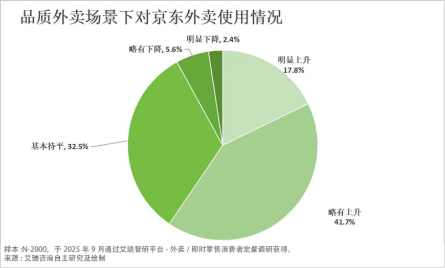 艾瑞数据的调研显示,补助退潮后,用户因价钱上涨呈现分化,部门价值驱动型用户更关心商质量量取办事体验,起头向能供给质量保障的平台迁移。有35。6%的用户暗示补助遏制后,将正在质量外卖范畴优先选择京东外卖,跨越其他两个外卖平台。更是有近六成(59。5%)的用户明白暗示,将添加正在京东点质量外卖的频次。