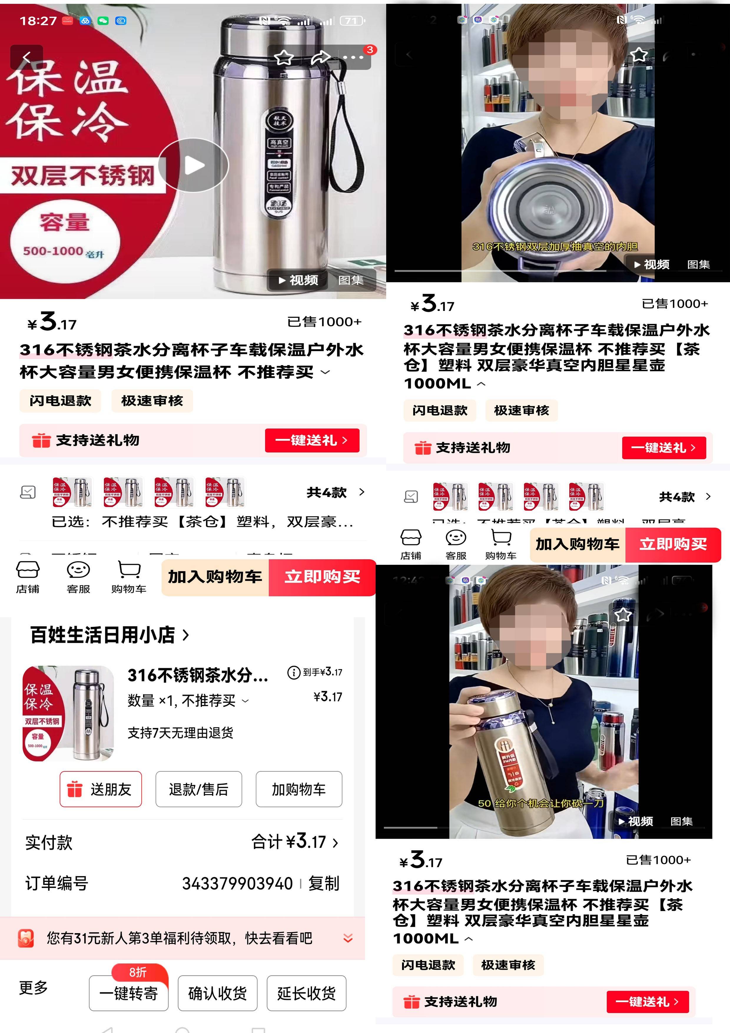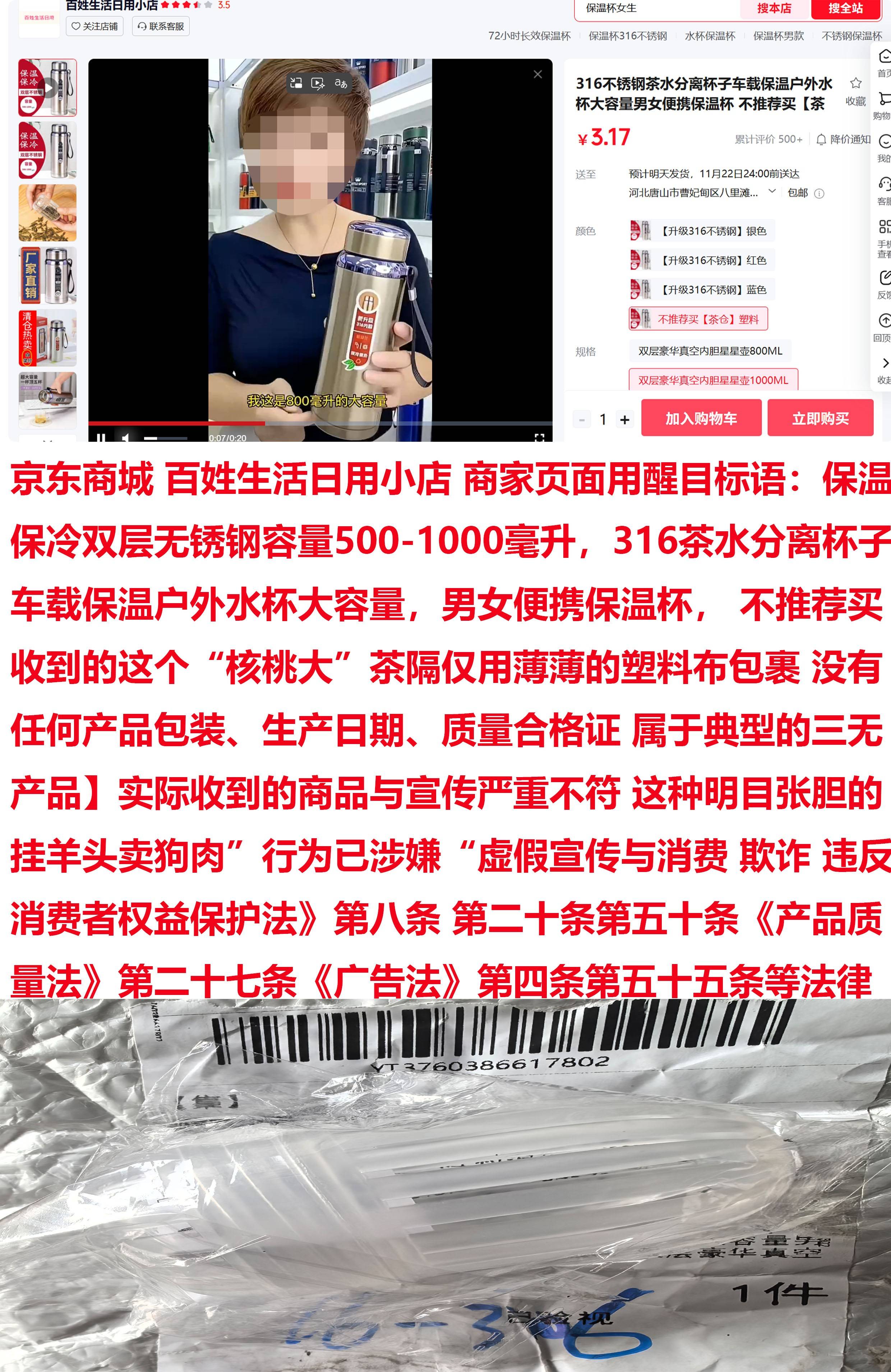 【图一:”京东商城“苍生糊口日用小店”页面上,夺目衬托着严重抢购空气。一款“保温、保冷、双层不锈钢、容量500-1000毫升,”的316不锈钢茶水分手杯子车载保温户外水杯大容量男女便携保温杯,不保举买。上有视频宣传,内容:【你来,这个杯子,你给几多,50,给你个机遇,带你砍一刀,那30,也用不了,我这是800毫升的大容量,里外都是加厚不锈钢的,仍是个新升级316不锈钢,双层加厚抽实空的内胆,冬天保热水,炎天能够保冷饮的,一年四时,都能够用,配的过滤,】,仅售3。17元。】。
